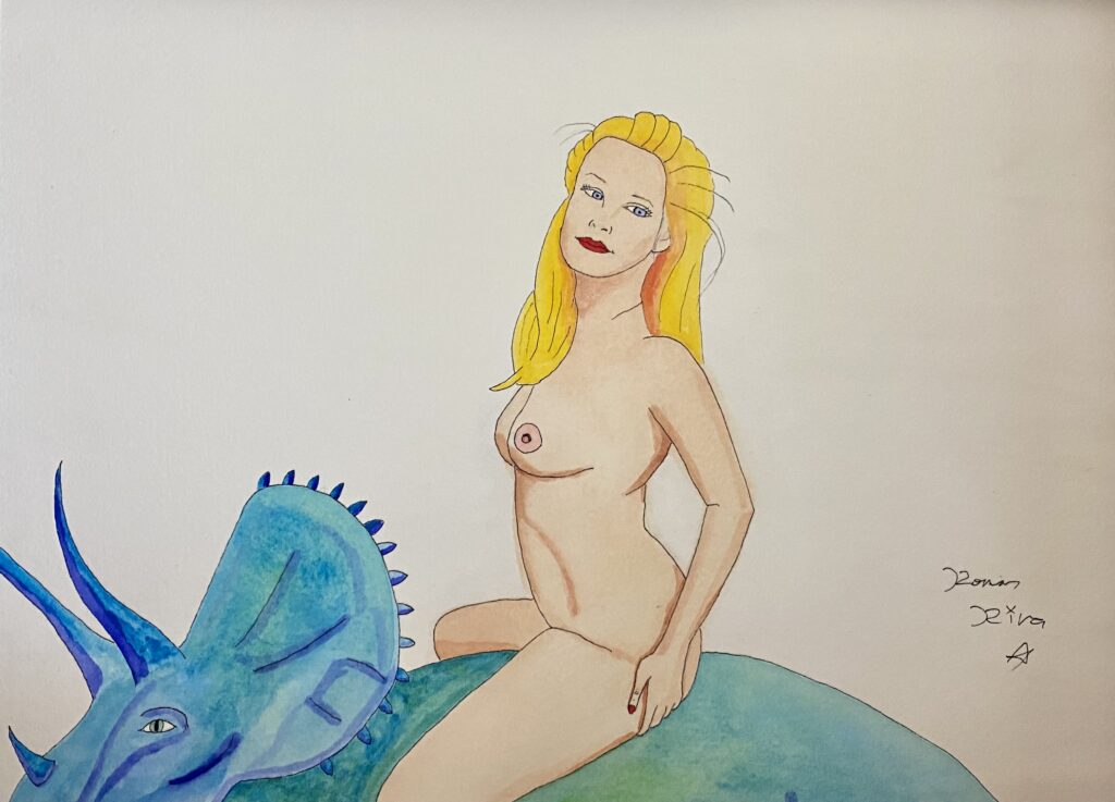 Allie and a Triceratops. Concept started off as a joke. Friend said “why aren’t people painting dinosaurs besides that Dinotopia guy?” So I got Allie to do a quick pose and voila! Watercolor & Ink 12″x9″. Original. Unframed. Only $299Roxy with a Baby T-Rex. Second in the dinosaurs series. A baby T-Rex should be cute, right? What if we put a busty Latina with a baby T-Rex? Watercolor & Ink 12″x9″. Original. Unframed. Only $299Allie Riding a Triceratops. Every boy’s favorite dinosaur was the T Rex. I was the only kid who preferred the triceratops. Because he reminds me of me. Just hanging out, minding his own business. But if you fuck with him, you’ll get 3 horns in your gut. Plus, they make fantastic steads. Allie’s proof of that. Watercolor & Ink 12″x9″. Original. Unframed. Only $299