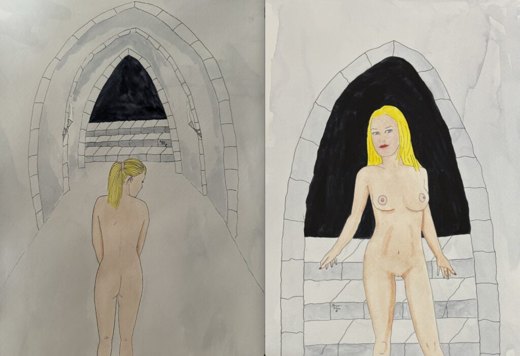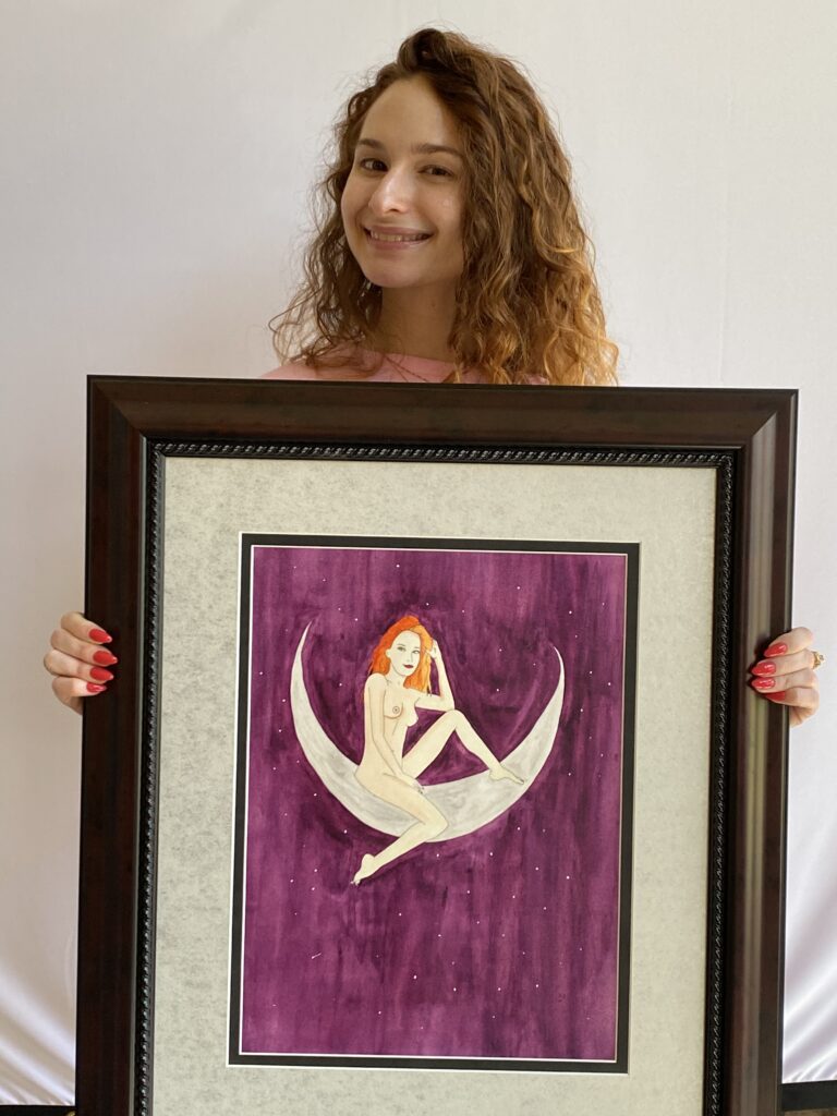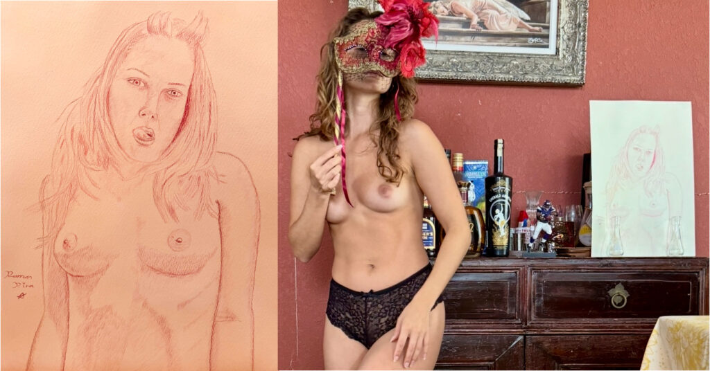 Allie 11″x14″ graphite sketch. Original. Only $99Katie as Selene, the Ancient Greek Goddess of the Moon. Katie has an amazing body! She was North Texas Bikini Champion a few years back. Currently she’s living in Bali full-time since she got signed by a major modeling agency. Watercolors & ink. Katie’s holding the painting so you can get an idea of the actual size (Katie is 5’4″). $999. Sorry, painting does not come with Katie.Diana as Selene. Watercolors & Ink. This is the twin painting of the one above. Same size, just with a different model. Diana’s a very successful Romanian model. She’s been in Vogue Italy. The print edition, not just the online. Only $999.Surviving the Darkness. Exactly as it sounds. Thank you Allie for her perfect job of acting. Those were the two emotions I wanted and she nailed them both! Double mixed media painting. Model – Allie. SOLDAllie 12″x18″ masterpiece, crimson lake on 140 lb earth tone stained watercolor paper. An ode to the Baroque Masters, Roman Riva pulls off an extraordinary feat. Right half of picture is Katie modeling with the work of art, showing its real size. Imagine this piece up in your home, rather than an Old World classy winery where it would fit right at home. Only $999 unframed.